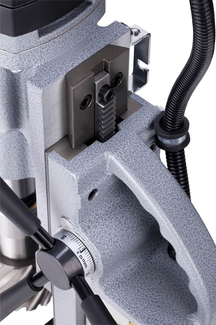 To model stworzony z myślą o wierceniu otworów w rurach o ściance o grubości większej niż 3 mm. Umożliwia to specjalnie zaprojektowana stopa wyposażona w dwa niezależne magnesy stałe o dużej mocy dopasowujące się do średnicy obrabianej rury. Odpowiednio opatentowana podstawa nie wymaga stosowania jakiegokolwiek źródła zasilania. Uniemożliwia to oderwanie urządzenia od obrabianego elementu w przypadku utraty zasilania. Zakres wiercenia frezami trepanacyjnymi wynosi 12–55 mm. Wiertarka posiada wbudowane gniazdo na stożku Morse’a 3 oraz wyposażona została w przełącznik kierunku obrotów prawo-lewo. Ich zmiana pozwala na gwintowanie za pomocą wiertarki.